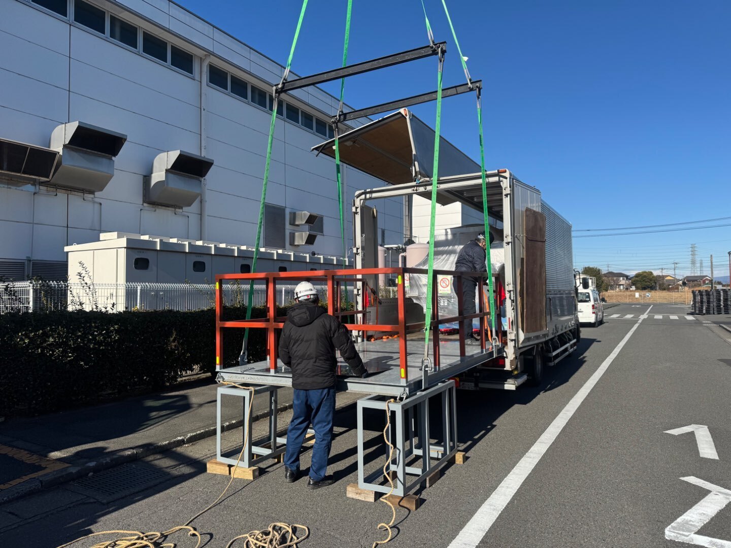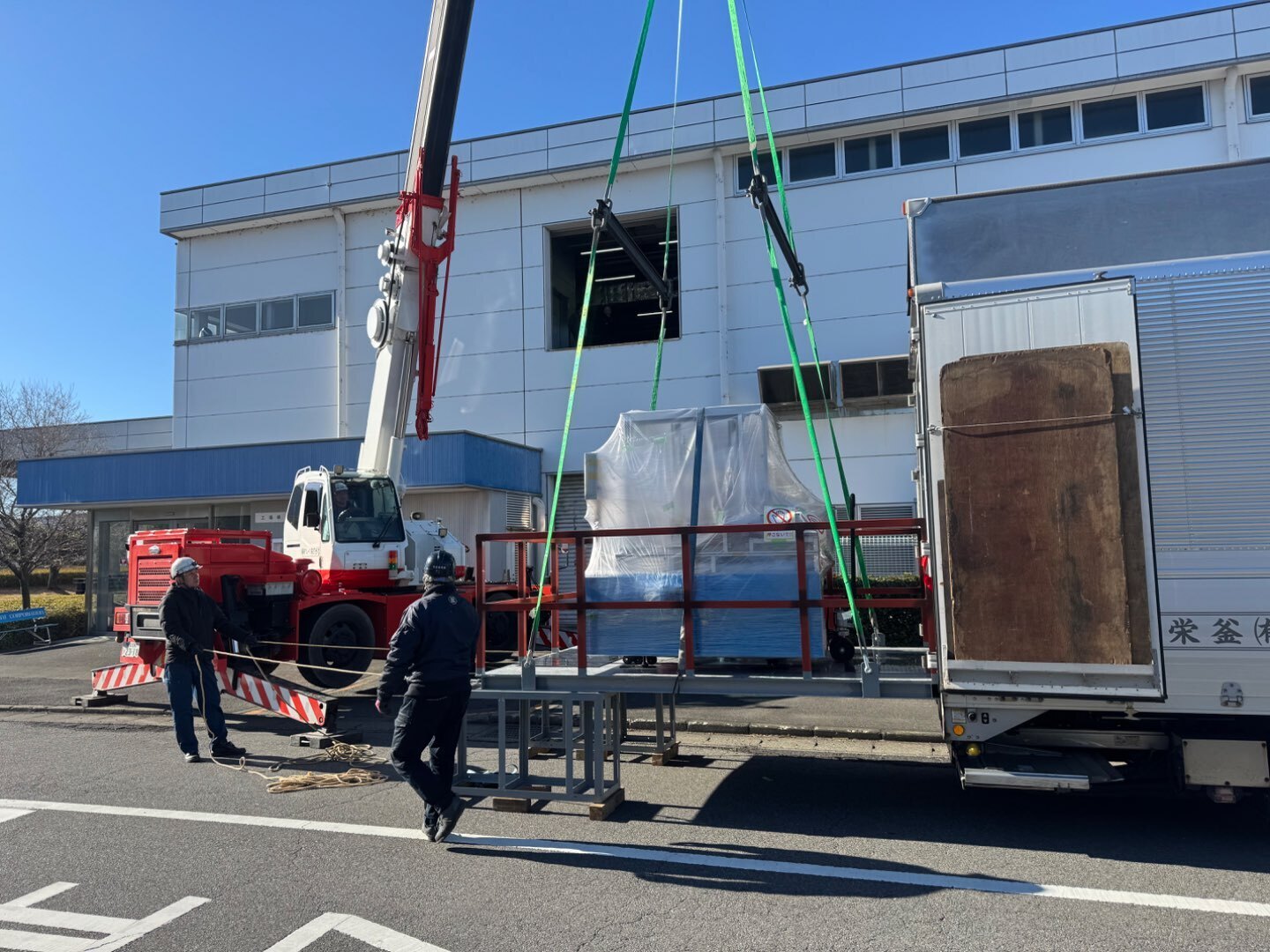 内容:ラフターにてゴンドラを吊り上げ工場2階のマシンハッチより設備を搬入