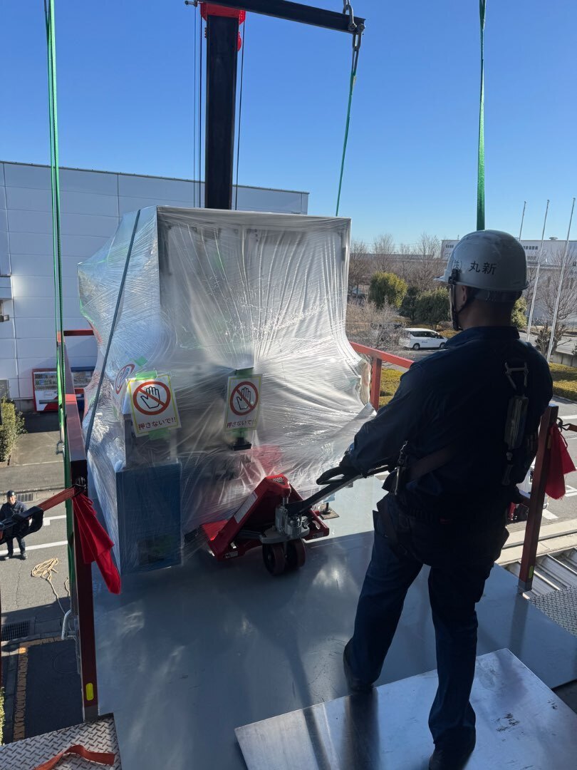 山梨県の機械メーカーから群馬県に運搬、ゴンドラにて2階に吊り上げ、引き込み搬入を行い設置しました。